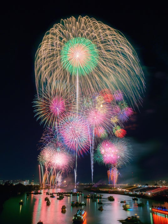 広範囲で同時に打ちあがるワイドスターマイン・都内最大の尺五寸玉(15号玉)など、