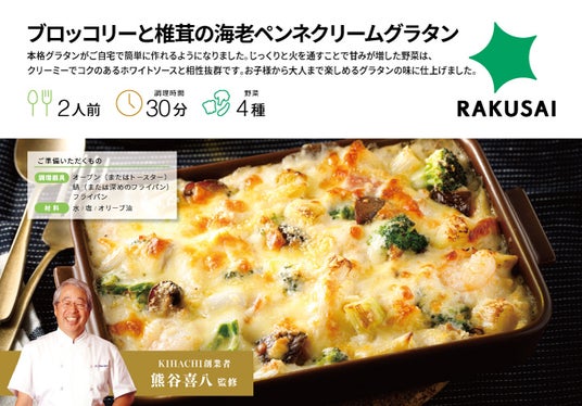 d130004-44-6512dd9f4309a358c1d07a2f3de3095f.pdf 楽彩株式会社(本社:東京都足立区/代表取締役社長:大崎善保)は、“ブロッコリーと椎茸の海老ペンネクリームグラタン”を9月9日(月)より販売いたします。KIHACHI創業者・熊谷喜八シェフ監修の本格クリームグラタンがご自宅で簡単に作れるミールキットです。食欲の秋にピッタリの逸品をお楽しみください。