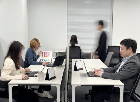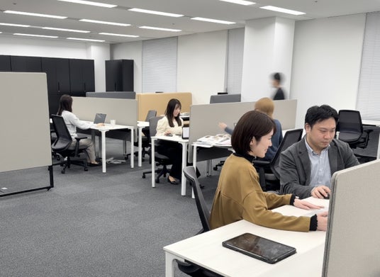 新オフィスは、フリーアドレス制を基本とし、部署を超えたコミュニケーションの活性化と柔軟な働き方を推進してまいります。同時に、各デスクにパーティションを設置し、向かい合わせの席でも視線が合わない構造を採用。オープンな環境を保ちながら、集中して業務に取り組める空間を実現しております。