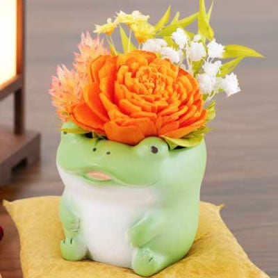 「無事に帰る」「お金が還る」「幸運が返る」の語呂合わせで交通安全・金運・若返りなどの縁起物として人気の高い「カエル」アレンジ。