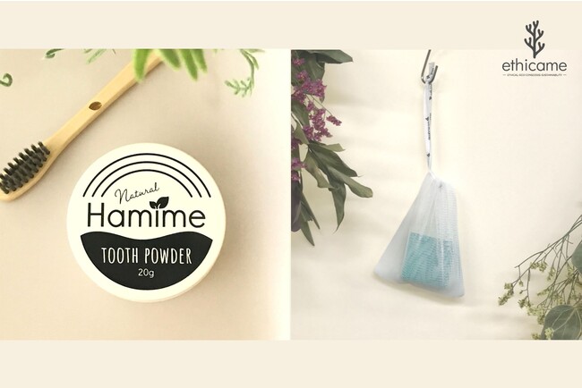 持ち手が竹でできている歯ブラシを使うことで、マイクロプラスチックによる海洋汚染の問題解決に貢献できます。竹歯ブラシと一緒に使いたいパウダー状の歯磨き粉「Hamime(ハミミ―)」はヴィーガン処方、もみ殻由来の生分解性パッケージです。