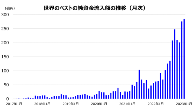 インベスコ・アセット・マネジメント株式会社(代表取締役社長兼CEO:佐藤秀樹、所在地:東京都港区)は、本日2023年2月13日に、世界のベスト「インベスコ 世界厳選株式オープン<為替ヘッジあり>(毎月決算型)/<為替ヘッジなし>(毎月決算型)、インベスコ 世界厳選株式オープン<為替ヘッジあり>(年1回決算型)/<為替ヘッジなし>(年1回決算型)」(追加型投信/内外/株式)が4ファンド合計で、2017年1月以来2023年1月までで6年超となる73カ月連続で純資金流入となり、運用資産残高も3000億円を突破したことを発表致しました。*1 2023年1月の流入額は約285億円と、月間純流入額において過去最高を記録しました。世界のベストの中でも、インベスコ 世界厳選株式オープン<為替ヘッジなし>(毎月決算型)への純資金流入額は、アクティブ運用を行う追加型公募株式投信の中で、月間第1位を記録しています。*2