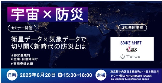 衛星データ解析システムの開発・販売を手がける株式会社スペースシフト(本社:東京都千代田区、代表取締役 金本成生)は、株式会社ハレックス(本社:東京都品川区、代表取締役社長:藤岡 浩之)、および株式会社Tellus(本社:東京都新宿区、代表取締役:山崎 秀人)と連携し、衛星データを用いた新たな防災・減災に対する技術を紹介するセミナーを開催いたします。