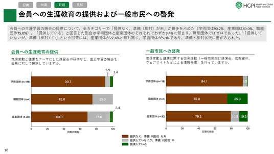 - それぞれの団体カテゴリー(医療系学術団体、職能団体、製薬・医療機器などの産業団体)に所属している会員への生涯教育や市民啓発の実施率は非常に低く、特に学術団体では9割以上が「実施なく、準備(検討)も未」と回答した