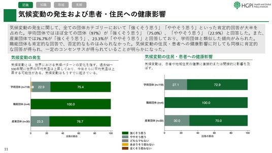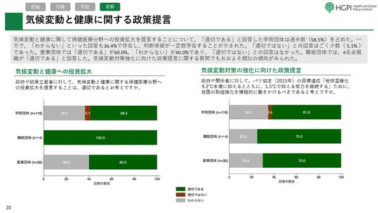 - 気候変動の健康影響や国際的な議論に関する知識は全体的に不足しており、職能団体は75.0%、学術団体は56.8%、産業団体は43.3%が「ほとんど知らない」「あまり知らない」と回答した