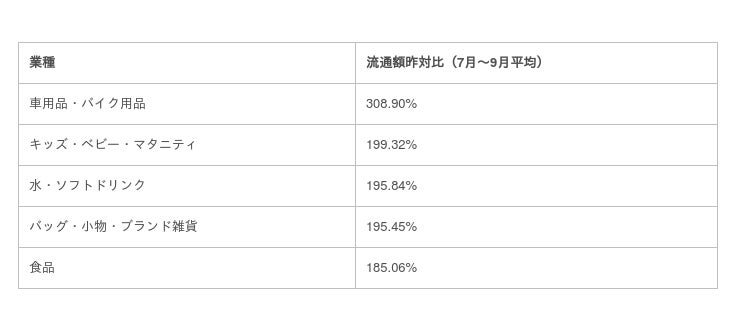 調査期間中、流通額の昨対比が高い順から5つ業界を下記に記しています。「キッズ・ベビー・マタニティ」「水・ソフトドリンク」「食品」などの生活必需品や日用品が並ぶほか、外出機会の増大にも伴い、「車用品・バイク用品」「バッグ・小物・ブランド雑貨」が上位にあがりました。
