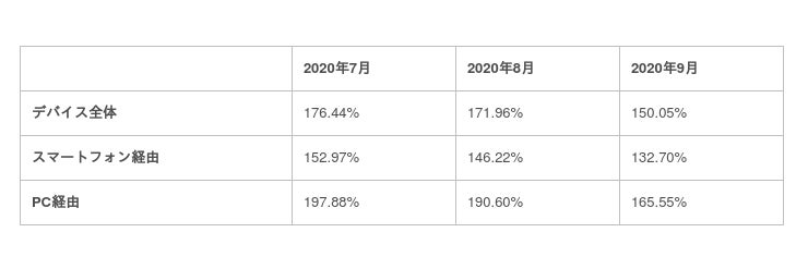対象店舗の注文件数は下記表2の結果のとおり、すべてのデバイスにおいて増加しました。2020年7月~9月期はデバイス全体の注文件数が昨対比166.15%でした。
