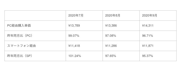 月別に見ると、2020年9月にわずかな落ち込みが見られますが、これは昨年同月は2019年10月1日に実施された消費税の税率変更前のかけ込み需要の影響と考えられます。具体的には軽減税率が適用されないアイテムで、高価格帯のもの、もしくは保存が効き、常備できるものの売上が昨年9月は高かった結果、この数字に反映されたと推測します。
