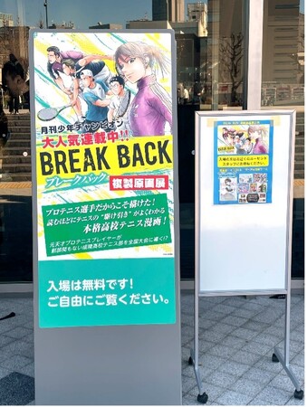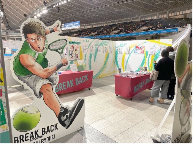『BREAK BACK』は、月刊少年チャンピオンで連載中の硬式テニス漫画。ケガで挫折し借金を背負った元世界ランキング7位の女子テニスプロ・上條紗季が、借金返済のために無名の成陵高校テニス部のコーチとなり1年で全国大会出場を目指す物語です。当日の会場内では、複製原画の展示に加え、作品に登場するキャラクターたちのオリジナルグッズを販売いたしました。