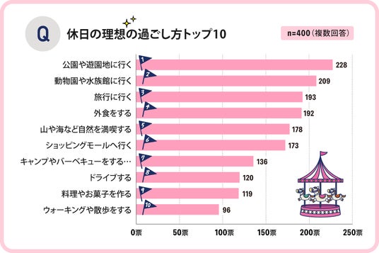 理想の過ごし方では1位が「公園や遊園地に行く」、2位が「動物園や水族館に行く」、3位が「旅行に行く」となっていました。