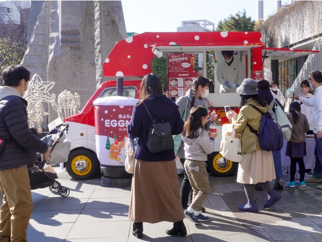 高品質・高付加価値の卵の商品提供だけでなく、卵の素材そのものを活かした加工食品の開発も行う株式会社アキタフーズ(本社:広島県福山市、代表取締役社長 岡田大介、 以下アキタフーズ)は、卵の魅力をより多くの方に伝えるため、卵を使用したドリンク『EGGNOG』を提供するキッチンカー“きよらのEGGNOG”を、12月25日(土)東京スカイツリーのソラマチひろばで出店しました。当日はクリスマスということもあり、東京スカイツリーにはいつも以上に多くの方が訪れており、カップルから親子連れ、ご友人同士のグループなど、沢山のお客様がキッチンカー“きよらのエッグノッグ”にご来店されました。東京スカイツリーでは、過去最高の販売数206杯/日を記録し、お客様からは「エッグノッグはクリスマスにピッタリのドリンクですね。ブランデーも入っていて、甘すぎず美味しい。」、「とにかく可愛いドリンクですね。子どもも大喜びです。」との嬉しいお声もいただきました。