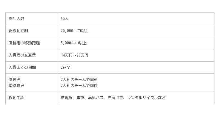 本キャンペーンの参加人数は50人強に留まったものの、参加者の総移動距離は2週間で合計70,000キロを超えました。また、入賞者の移動費用は最大20万円以上となり、その移動距離は最大5,000キロ以上でした。