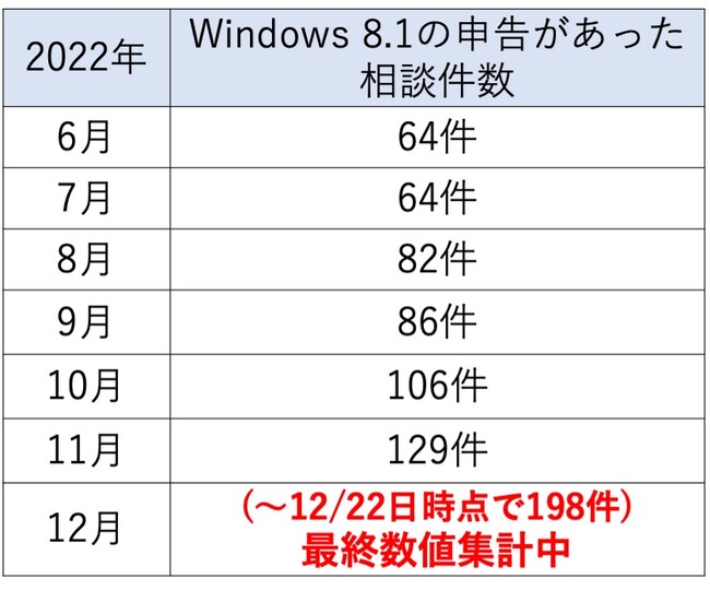 当社には半年前の2022年6月頃より徐々に相談が増加し、11月時点で相談件数は倍以上に増えています。 終了を目前に控えた12月にはさらに問い合わせが増加している傾向がありました。「Windows 8.1を使い続けていいのか教えて欲しい」・「アップグレードしたいが自分では難しい」といったサポート終了を目前にして不安を持った相談が増えています。また、アップグレード後のトラブルや、新しいOSの操作に慣れず助けを求める声も寄せられています。