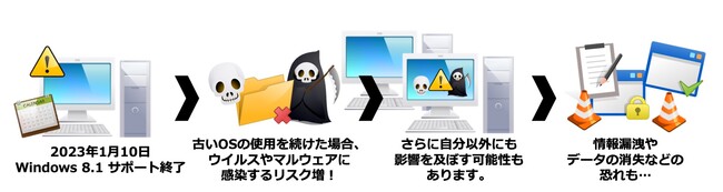 サポートが終了したOSを使い続けると、不具合や新しいウイルスの攻撃に対する脆弱性の対策となる修正プログラムが提供されなくなります。セキュリティが万全ではないとても危険な状態で、情弱性を狙った新たなウイルスに感染してしまうリスクが急激に高まるため、そのまま使うことは推奨しません。