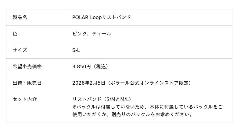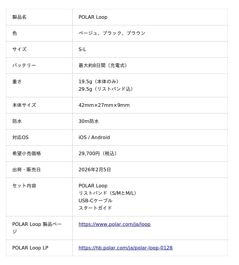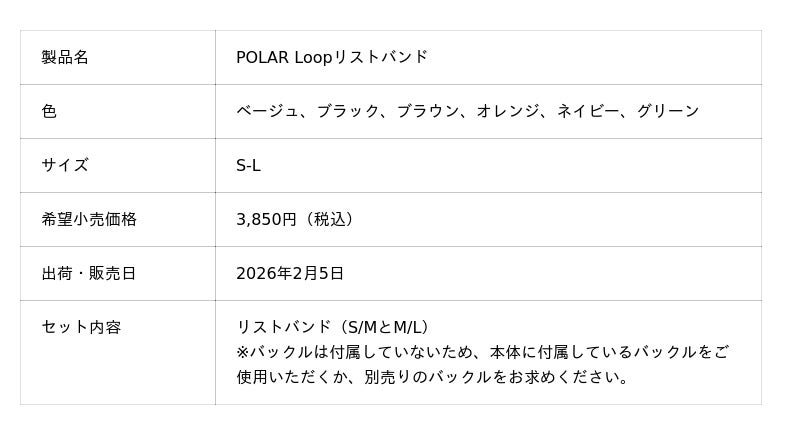 スポーツ用ウェアラブルデバイスのリーディングカンパニーであるポラール・エレクトロ・ジャパン株式会社(本社:東京都千代田区神田、代表取締役:榊原伸司)は、スクリーンレス(液晶画面なし)の革新的な設計が特徴のリスト型ヘルスケアバンド「POLAR Loop(ポラール ループ)」を、2026年2月5日(木)よりオンラインを含む全国のポラール製品正規取扱店にて発売いたします。また、ポラール公式オンラインストアでは本日より予約販売を開始いたします。希望小売価格は29,700円(税込)で、カラーはベージュ、ブラック、ブラウンの3色展開、S/MおよびM/Lの2サイズのリストバンドが同梱されています。