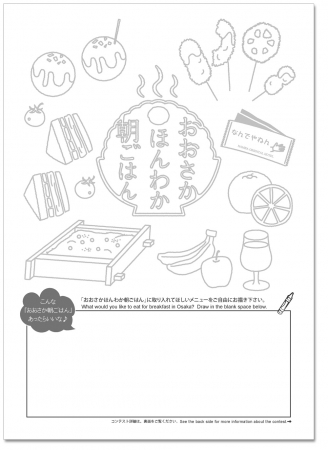 今年のテーマは、ホテルの朝食「おおさかほんわか朝ごはん」をぬりえでお楽しみいただくほか 、”こんな朝ごはんあったらいいな!”をご自由に描いて頂きます(クレヨンも進呈)。開催期間中、4歳以上のご宿泊者様を対象とし、ご参加頂いた方全員に参加賞をお渡しいたします 。