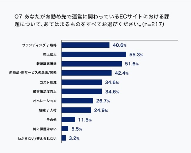 現在運営に関っているECサイトにおける課題について質問したところ、多くのEC事業者が「売上拡大」、「新規獲得」をすることが最も大きな課題と回答しました。ECを運営していくために継続的な売上拡大や新規顧客の獲得は必要不可欠である一方で、オペレーション面や組織、人材など、仕組みや体制面に関する課題意識は低い結果となりました。