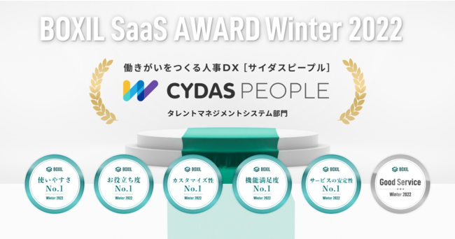 株式会社サイダス(本社:東京都港区、代表取締役:松田 晋、以下 サイダス)が提供するタレントマネジメントシステム「CYDAS PEOPLE(サイダスピープル)」は、スマートキャンプ株式会社(以下「スマートキャンプ」)が今最も評価されているSaaS(※)を表彰する「BOXIL SaaS AWARD Winter 2022」でタレントマネジメントシステム部門「Good Service」ほか5つのNo.1に選出されたことをお知らせいたします。
