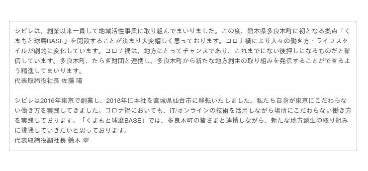 2016年より地方創生、地域活性を柱に事業を推進してきたシビレ株式会社(本社:宮城県仙台市、代表取締役:佐藤陽、鈴木翠)は、事業拡大に伴い、熊本県球磨郡多良木町に「くまもと球磨BASE」を開設することをお知らせいたします。拠点開設に伴い、2021年5月7日13時30分から熊本県庁にて熊本県 木村敬 副知事立ち合いのもと、多良木町(町長:吉瀬浩一郎)と立地協定調印式を行います。また、同日熊本県多良木町の地域商社 一般財団法人たらぎまちづくり推進機構(代表理事:明石照久)と包括連携協定を締結します。