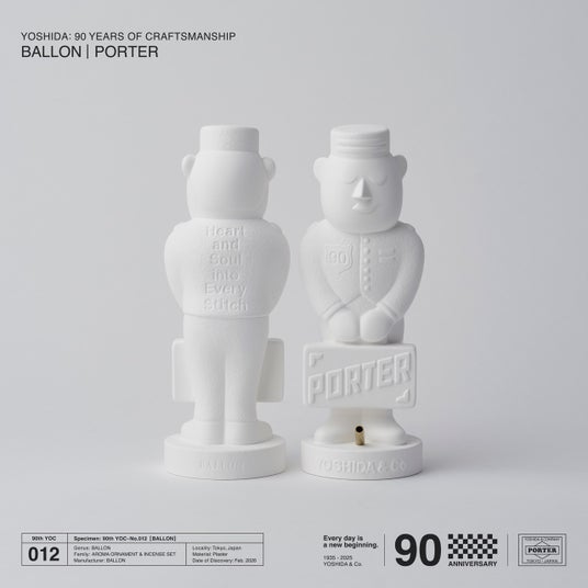 PORTERの店頭でにこやかに出迎えてくれるキャラクター「ポーターくん」を石膏で表現しました。ポーターくんの胸には 90 周年のエンブレム、背中には吉田カバンのモットーである「一針入魂」を意味する「Heart and Soul into Every Stitch」の文字を施しています。 石膏表面はさらっとした艶やかな面と、素材感の残るきめの粗い面を使い分け、立体感が出るようこだわりました。