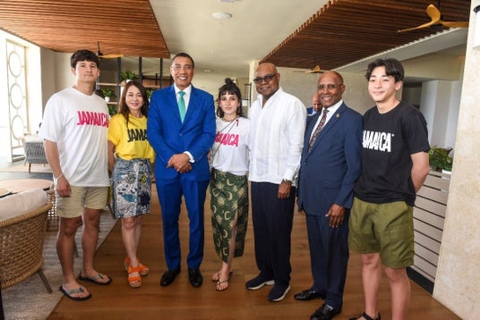 画像提供 (C)The Jamaica Tourist Board:アンドリュー・ホルネス・ジャマイカ首相(左から3人目)、エドマンド・バートレット観光大臣(右から3人目)、オービン・ヒル産業・投資・商業大臣が、ジャマイカ人ハードル選手ハンスル・パーチメント氏を助けた2020年東京オリンピック・ボランティアのテイヤナ・カワシマ・ストイコビッチさんと記念撮影。(左から右へ)弟のミーシャ・カワシマ・ストイコビッチさん、母のユキ・カワシマ・ストイコビッチさん、弟のアンドリヤ・カワシマ・ストイコビッチさん。