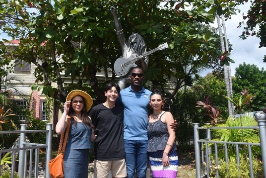 画像提供 (C)The Jamaica Tourist Board:ボブ・マーリー博物館でテイヤナ・カワシマ・ストイコビッチさん(右)と再会したオリンピック金メダリストのハードル選手ハンスル・パーチメント氏(右から2人目)。(左から右へ)母親のユキ・カワシマ・ストイコビッチ・ユキさん、弟のアンドリヤ・カワシマ・ストイコビッチさん。