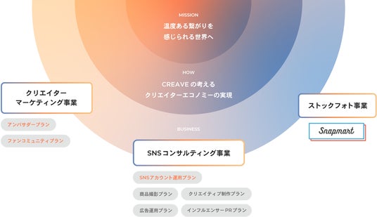 SNSに馴染むおしゃれでナチュラルなフリー素材をインターネット上で売買できるプラットフォーム「Snapmart」を運営。販売素材数は700万枚以上。CREAVE事業紹介ページ: https://creave.co.jp/service/