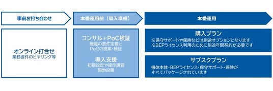 「BEPサーベイランス」は、お客様のご要望にあわせて購入プラン・サブスクプランを用意しています。また、どちらのプランでも導入支援として初期設定や講習なども提供しています。