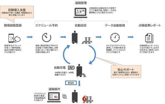 - 従来、施設内データ収集の多くは、人の巡回による目視と紙による記録で行われており、広大な敷地内の移動や点検項目が多岐にわたるなど膨大な手間と時間を要していました。今回提供する「BEPサーベイランス」は、高画質カメラやサーモカメラ、マイクなど、人の目や耳に代わるデバイスを搭載したUGVが施設内を定期的に自動巡回し、設備状況や計器の数値などのデータ収集を自動で行います。巡回後は充電ポートに帰還するので施設内の無人化に寄与します。