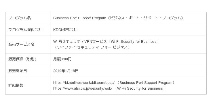アルプス システム インテグレーション株式会社(本社:東京都大田区、代表取締役社長:永倉 仁哉、以下ALSI〔アルシー〕)は、KDDI株式会社(本社:東京都千代田区、代表取締役社長:高橋 誠、以下KDDI)が提供するSaaS型パートナー支援プログラム「Business Port Support Program」を通じて、ALSIの企業向けWi-FiセキュリティVPNサービス「Wi-Fi Security for Business」の販売を、2019年1月18日より開始したことをお知らせいたします。