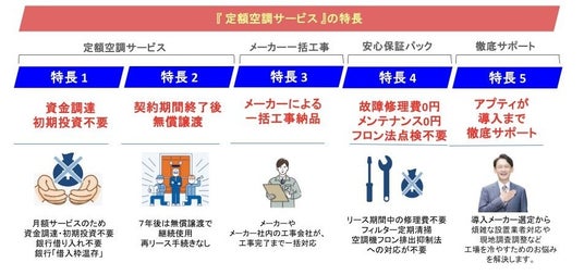 初期導入費用0円でエアコンが導入でき、メーカー選定、価格交渉、設置課題の解決、工事完了、そして設置後のPR支援まで、当社がワンストップでサポートします。