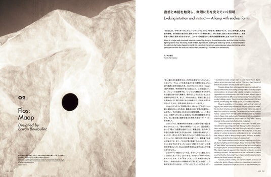 「Maap」は、デザイナーのエルワン・ブルレックとイタリアのモダン照明ブランド、フロスが共創した大型壁付照明。薄く軽量で耐久性に優れたタイベック素材を用い、手で自由に造形できるのが特徴だ。完成形を一方的に提示するのではなく、ユーザー参加型という現代の価値観を映し出すプロダクトである。