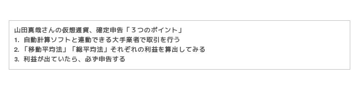 個人の方の仮想通貨への投資によって得られた利益については、現状では雑所得として確定申告することになっており、自身で年間の損益を計算し、一定の利益が出ている場合には税務署に届け出る必要があります。以下に、個人の方の確定申告の際に気をつけるべきポイントなどについて、公認会計士・税理士の山田真哉さんの解説をご紹介します。