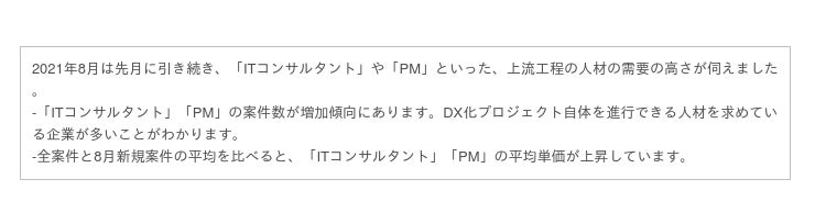 「PM」「ITコンサルタント」の案件は、数だけでなく平均単価も上昇していることがわかります。特に「ITコンサルタント」において、8月の新規案件は全案件の平均と比べて8万円以上高く、需要の高さがうかがえます。