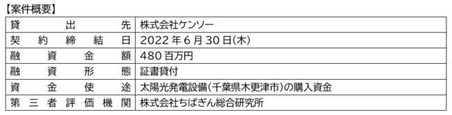 貸出先の株式会社ケンソーは、太陽光発電を主力とする再生可能エネルギー発電所の開発および運営を手掛けており、今回調達した資金は、太陽光発電設備(千葉県木更津市)の購入資金に充当されます。再生可能エネルギー由来の電力を発電することにより、発電時のCO2排出量の削減が見込まれ、持続可能な環境・社会の実現への貢献が期待されます。