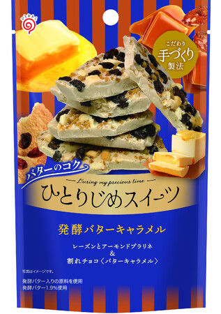 2023年秋冬は、ひとりじめスイーツ贅沢オランジェ・ひとりじめスイーツ贅沢ラムレーズン・ひとりじめスイーツアップルチョコレート・ひとりじめスイーツ贅沢ストロベリーの通年商品4品をリニューアル。2023年秋冬限定商品に「ひとりじめスイーツ発酵バターキャラメル」を新たに発売致します。発酵バターを1.9%使用したコクのあるキャラメル風味のチョコレートにココアクッキー、アーモンドプラリネ、レーズンをトッピングしています。