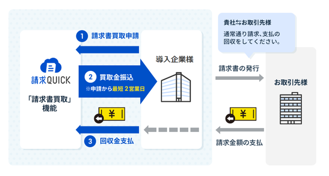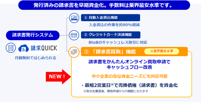 発行済みの請求書を必要な時に早期資金化できる「請求書買取」機能が、「請求QUICK」のオプションとして6月23日よりお使いいただけます。請求書の作成・発行から入金消込、仕訳計上など請求書関連業務の工数を約90%削減*1できる基本機能に加え、BtoB取引のキャッシュレス化を可能にするクレジットカード決済機能を標準搭載した「請求QUICK」に本オプションが加わることで、中小企業にとって重要な資金繰りの課題を請求書関連業務の効率化と同時に改善することができます。