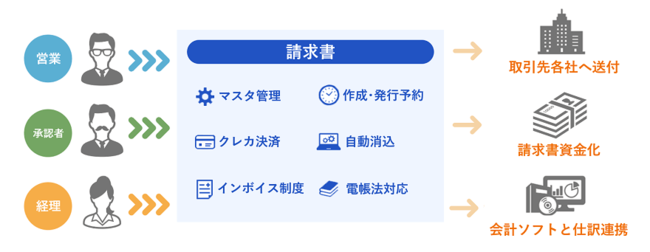 「請求QUICK」は、Webブラウザで利用できるクラウド型請求書発行システムです。請求書をWeb上で作成・承認・発行できることに加え、全国の金融機関と連携することで入金消込の手間を大幅に軽減することを実現しています。さらに、会計ソフトと連携することで、請求書発行にかかる社内の業務フローを明確にし、請求書の発行から消込、会計処理までの作業を効率化することができます。