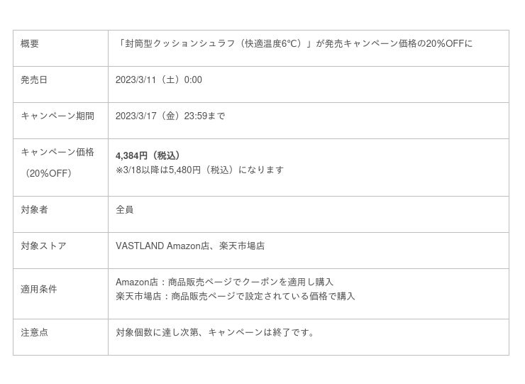 VASTLAND株式会社(本社:兵庫県姫路市/代表:田中悠貴)は、国際規格「ISO23537(EN13537 ヨーロピアンノーム)」で確認済の保温力で3シーズンに対応し、クッションにもなる「封筒型クッションシュラフ(快適温度6℃)」を2023/3/11(土)にAmazon店&楽天市場店で先行発売することを決定しました。また発売を記念して、Amazon店&楽天市場店限定で20%OFFの価格で購入できる「発売キャンペーン」を開催します。