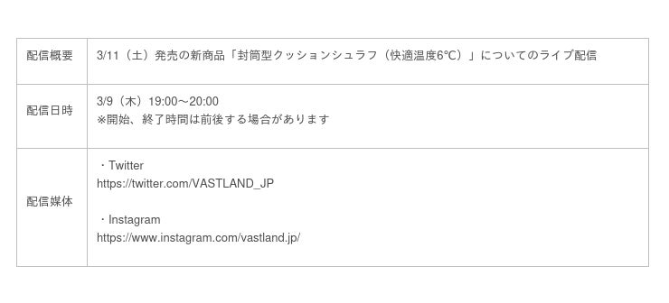 3/9(木)19:00より「封筒型クッションシュラフ(快適温度6℃)」に関するライブ配信をVASTLAND公式Twitter・Instagramアカウントで開催します!