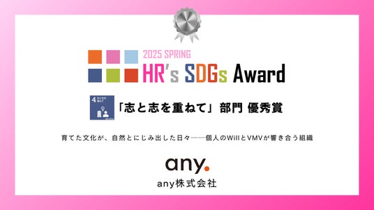 any株式会社(所在地:東京都千代田区、代表取締役:吉田和史、以下:any)は、One HRが主催する「HR’s SDGsアワード2025」において、「志と志を重ねて」部門の優秀賞を受賞しました。
