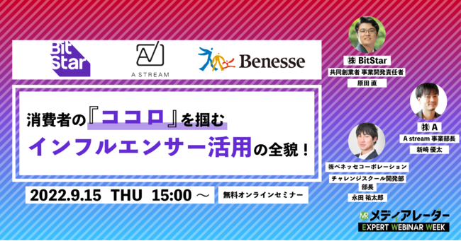 この度、A streamプロダクトマネージャー新崎優太が、メディアレーダー様主催のウェビナー「消費者の『ココロ』を掴むインフルエンサー活用の全貌!」にて、「高精度なターゲティングと、良質なインフルエンサーの発見の効率化」をテーマに登壇いたします。
