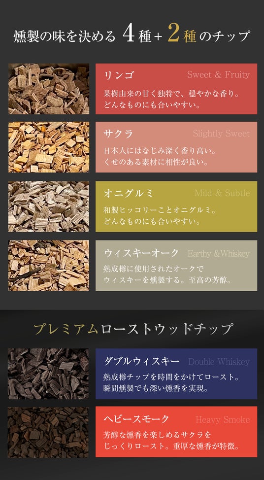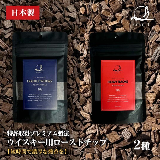 また、smott本体とは別売りとなりますが、燻製ウイスキー専用に開発された「HEAVY SMOKE(ヘビースモーク)」「DOUBLE WHISKY(ダブルウイスキー)」2種のプレミアムローストチップも同時発売となります。