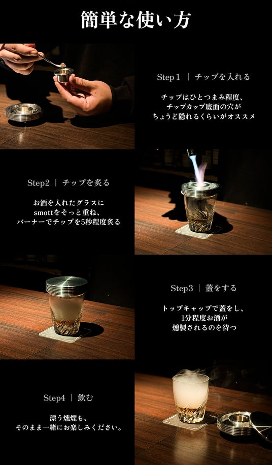 誰でも手軽に1分でお酒の燻製を楽しんでいただけるジュラルミン製グラストップスモーカー「smott(スモット)」が、2024年4月15日(月)18時より公式STORE( https://smott.jp/ )をオープン、一般販売を開始します。