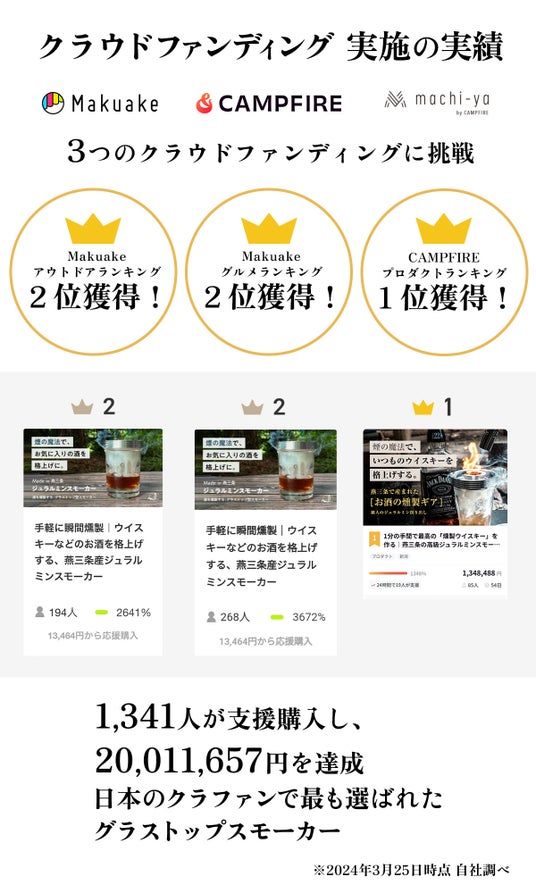日本のクラウドファンディングで最も選ばれたグラス用燻製器です。
