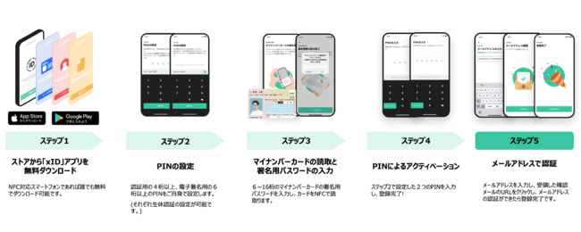 『xIDアプリ」は、マイナンバーカードと連携することで、より手軽に本人確認、本人認証、電子署名ができるデジタルIDアプリです。初回登録時にマイナンバーカードの署名用電子証明書をスマートフォンのNFCで読み取り、本人確認を実施することでIDを生成。以降、xIDアプリを使って電子認証・電子署名を行うことで、金融サービス利用開始時の本人確認や行政手続きをオンラインで完結させることができます。