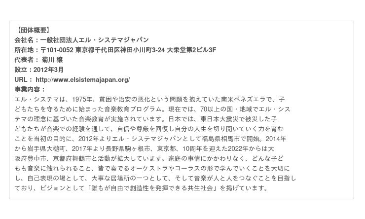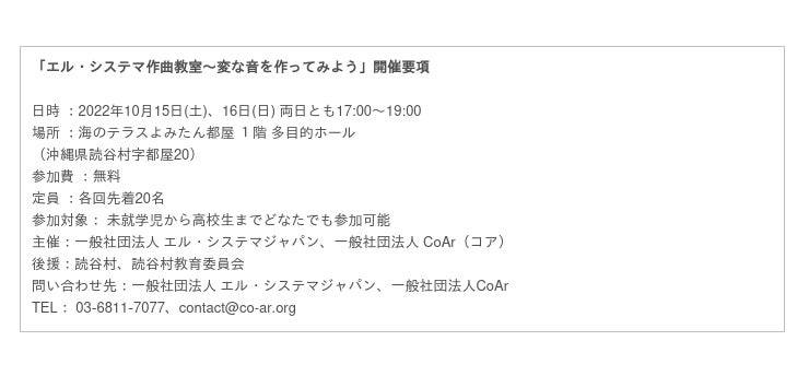 一般社団法人エル・システマジャパン(東京都千代田区)は、2013年から福島県相馬市を中心に、ロンドン在住で世界的な現代音楽作曲家・藤倉大氏の監修のもと「エル・システマ作曲教室」を開催してきました。今回、この他にはないユニークな教室を、沖縄県を中心に全国で芸術文化活動を支援する一般社団法人CoAr(コア)(沖縄県読谷村)と協働し、読谷村役場、読谷村教育委員会の後援のもと、沖縄で初めて開催します。コロナ禍を経て3年ぶりの再開でもあります。メディア関係の皆さまにおかれましては、イベントのご取材をいただければと思います。