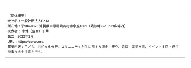 子どもたちの活動、芸術文化活動を支援する組織。2022年より「感受性の循環する世界」を目指して、沖縄県を中心に全国で芸術文化活動に関するコンサルティングやイベント企画を行っています。