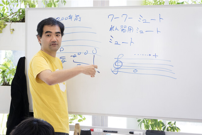 この教室では、毎回様々な分野で活躍する音楽家を講師として招きます。集まる子供たちは、音楽経験のある子・ない子とさまざまです。子どもたちは、音楽家や作曲家との対話を通して、試行錯誤しながら自由な発想を譜面にこめ、「世界にたった一つに自分の曲」を紡ぎあげます。子どもたちの想像力・好奇心には、世界的な作曲家や演奏家の方々も舌を巻くほどで、言語を超える音楽の力や子どもたちの無限の可能性を強く感じる場所でもあります。