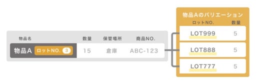 たとえば、物品Aという「親」の在庫データに対して、ロット番号が異なる物品Aの「子」データを複数紐づけて登録することができます。